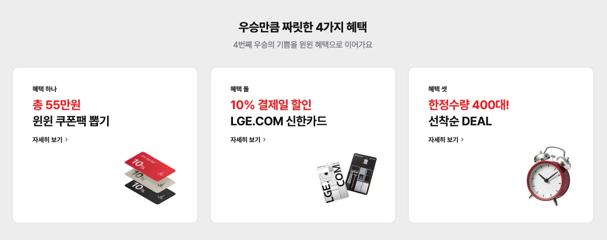 우승만큼 짜릿한 4가지 혜택 - 혜택 1. 총 55만원 윈윈 쿠폰팩 뽑기! - 혜택 2. 10% 결제일 할인, LGE.COM 신한카드 - 혜택 3. 한정수량 400대! 선착순DEAL
