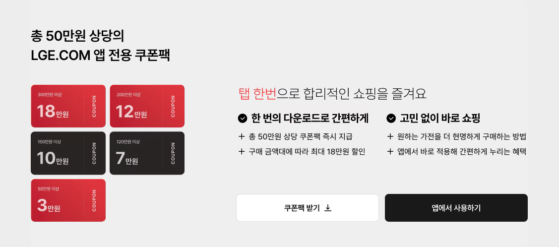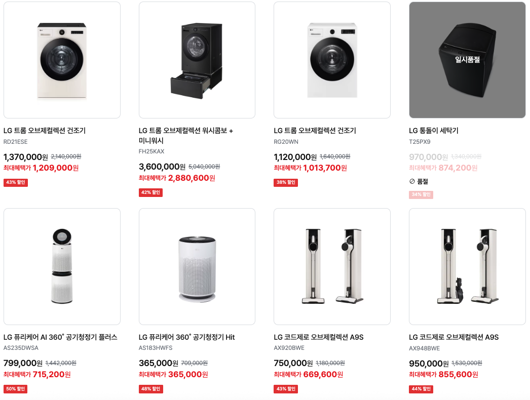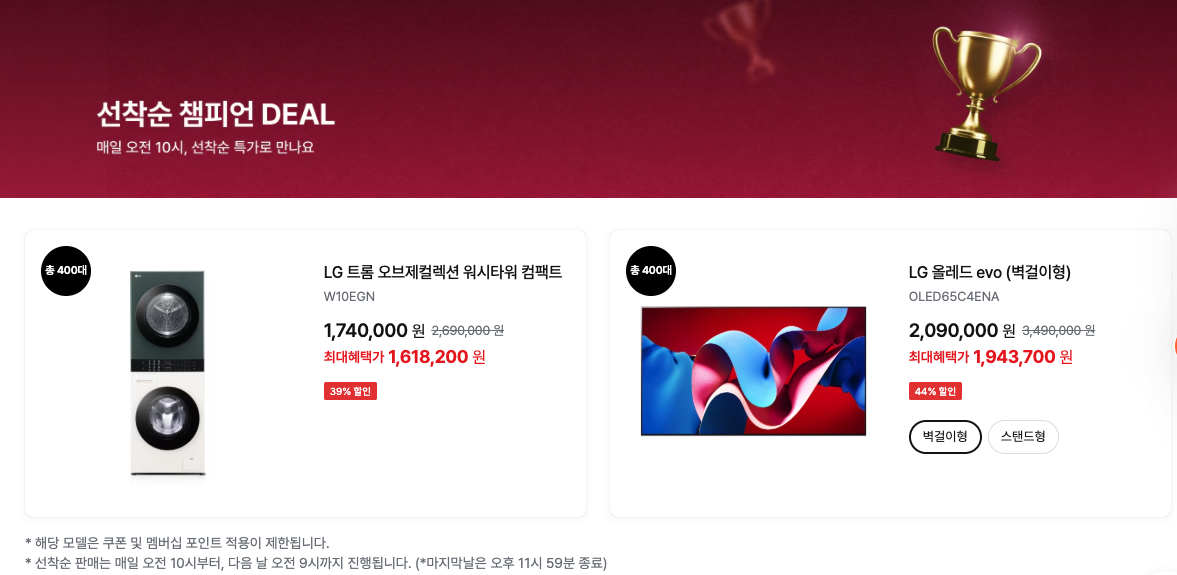 - 매일 오전 10시 선착순 딜 진행(LG트롬 오브제컬렉션, LG 올레드 벽걸이 TV 등)